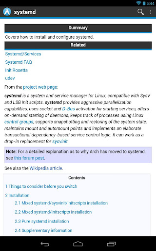 Z ratunkiem przychodzi na ArchWiki Viewer - aplikacja dla Androida, dzięki której mamy łatwy dostęp do przejrzystej Wiki Arch Linux'a. Aplikacja nie jest zbyt wielka i wymaga tylko telefonu z Androidem, więc może się przypodobać wielu użytkownikom Archa, którzy posiadają również telefon/tablet/pralkę/piwo z Androidem. Aplikacja jest dostępna w Sklepie Play.